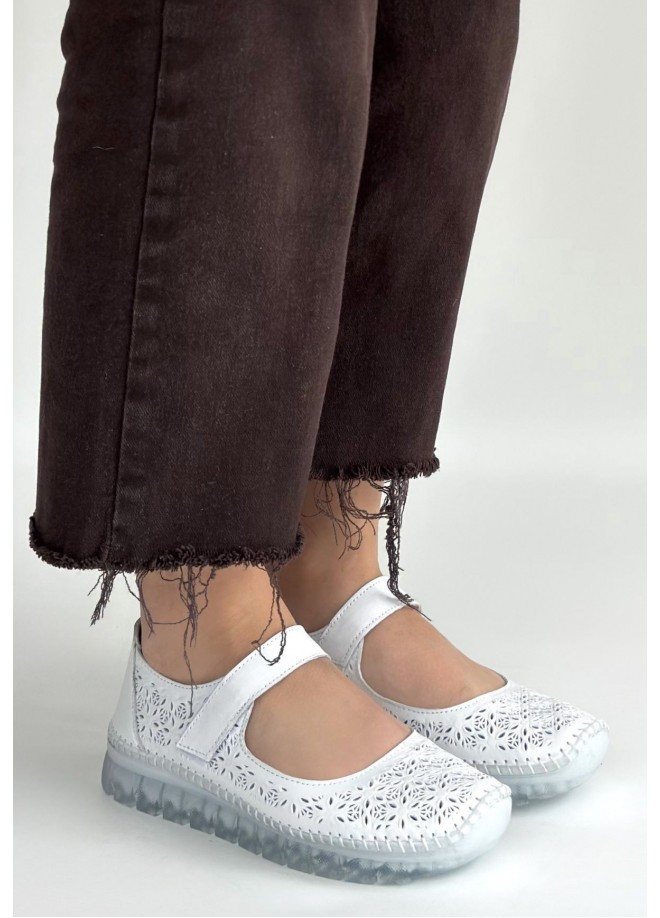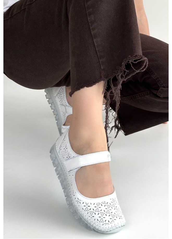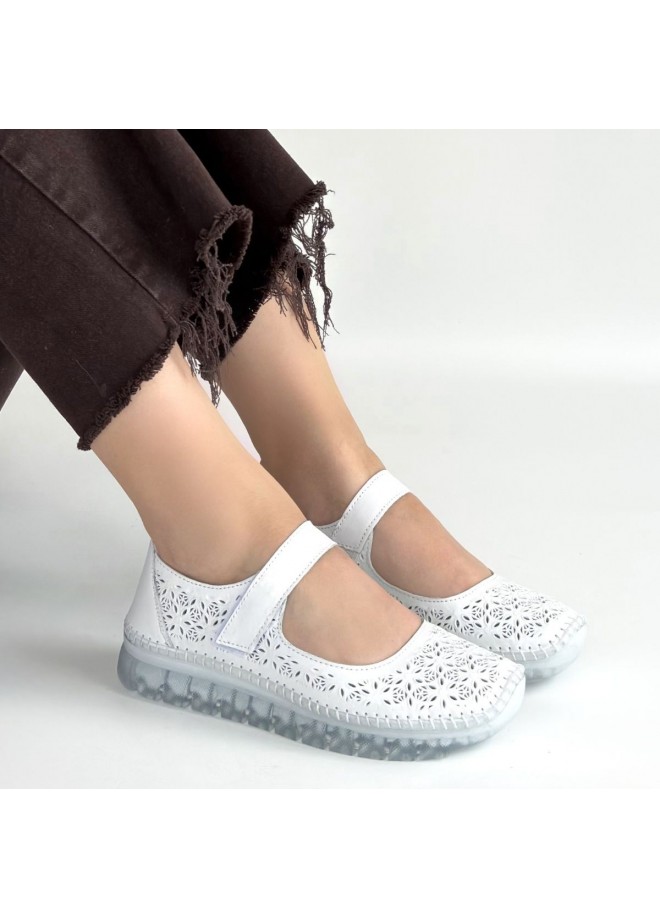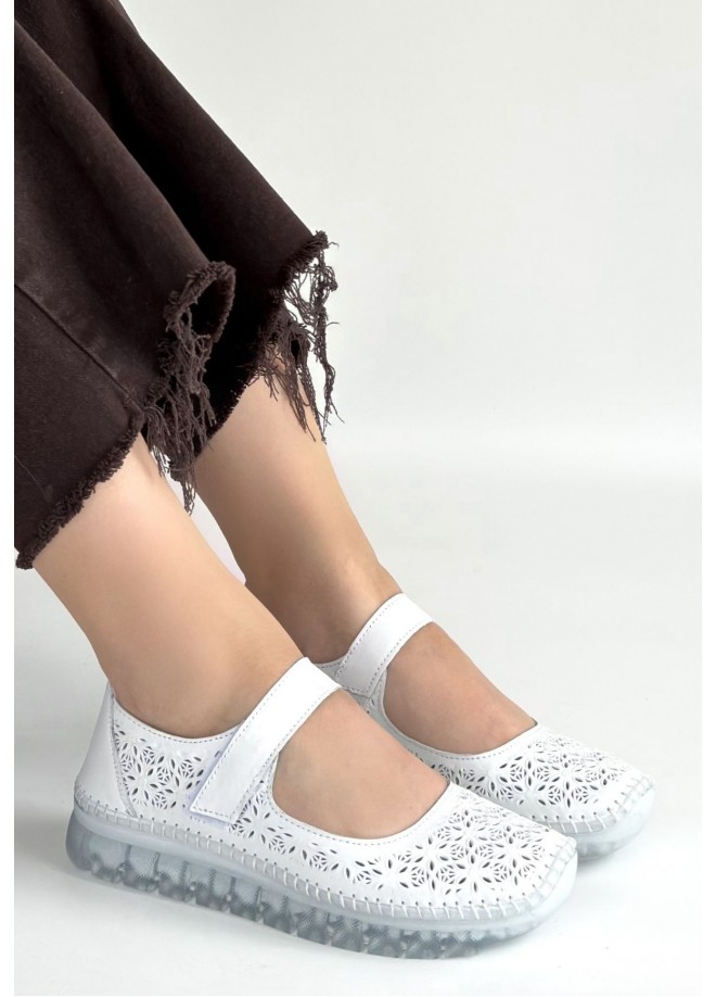 Sina Beyaz Deri Cırt Cırtlı Babet Ayakkabı