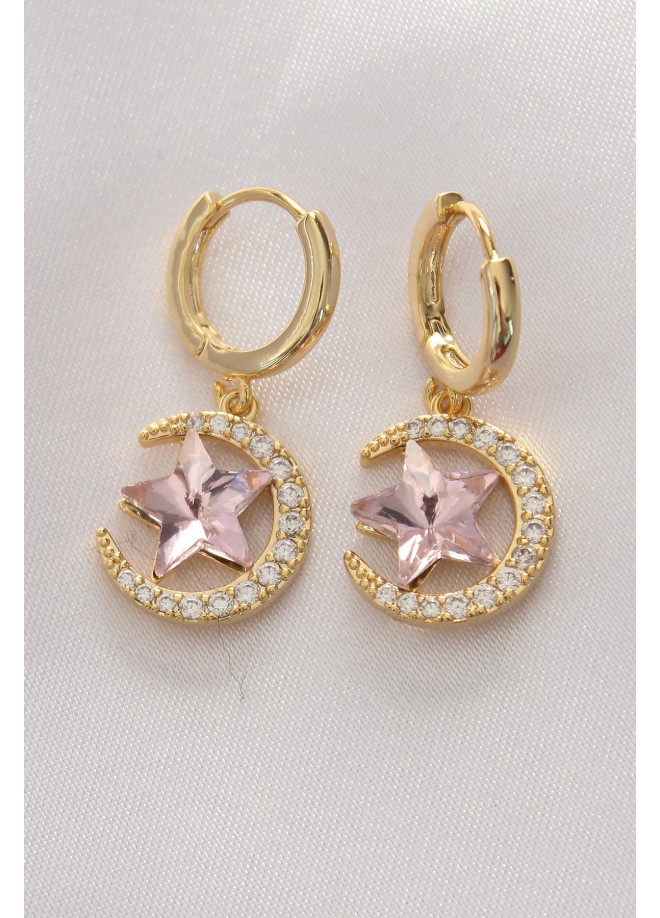 Erb Pirinç Gold Renk Pembe Zirkon Taşlı Yıldız Detay Ay Küpe