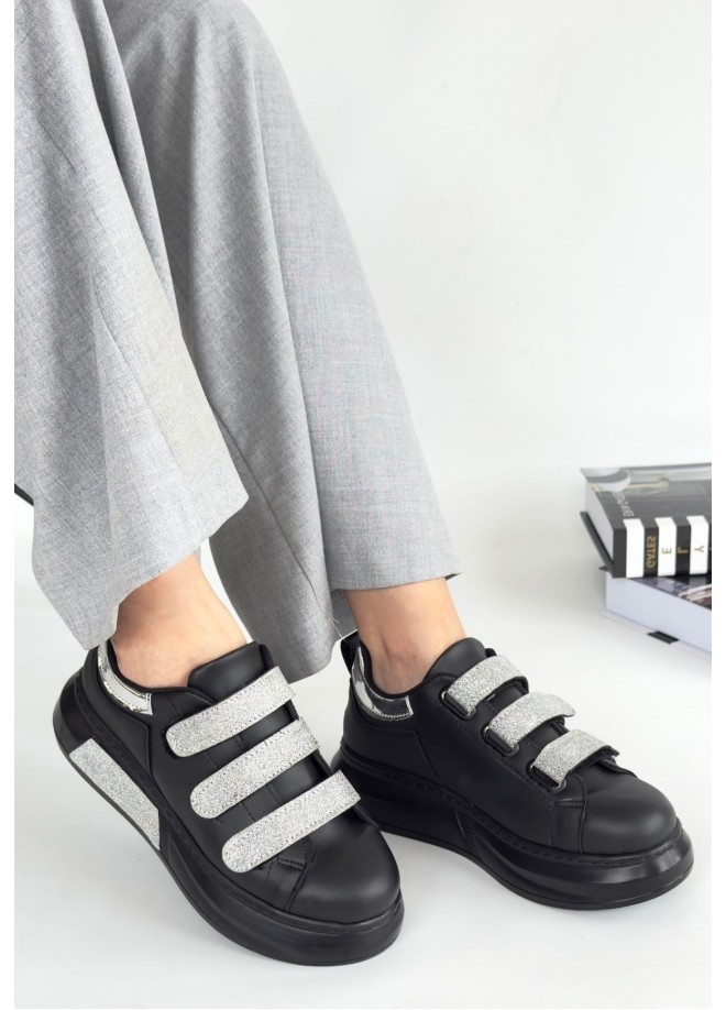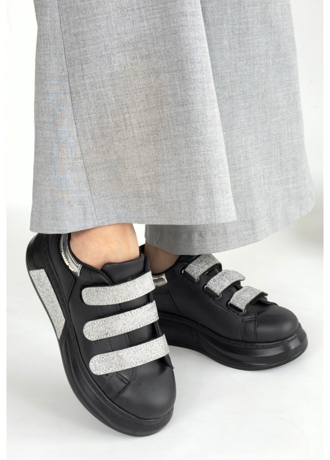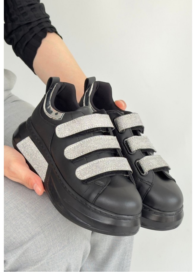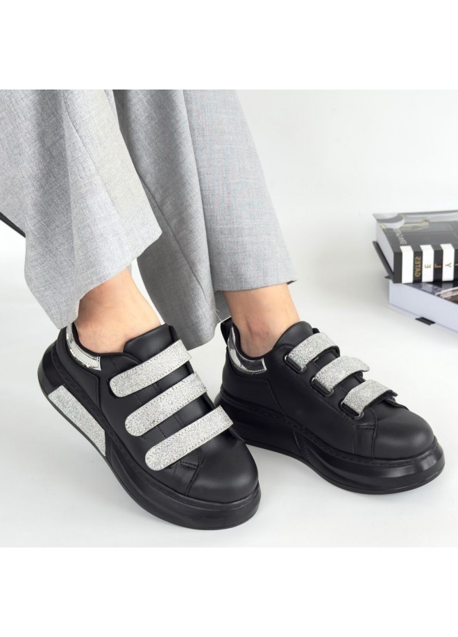 Elika Siyah Cilt Simli Cırt Cırtlı Spor Ayakkabı