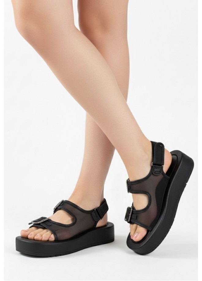 Sinna Siyah Cilt Tül Detaylı Sandalet