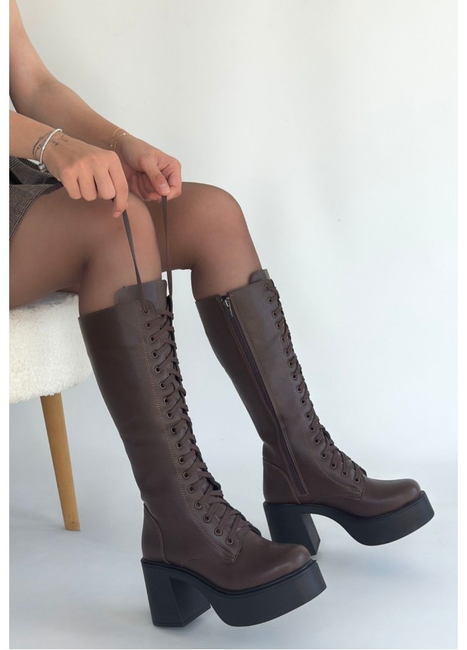 Guay Kahverengi Cilt Bağcıklı Topuklu Çizme