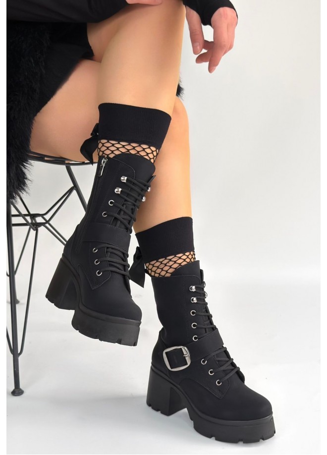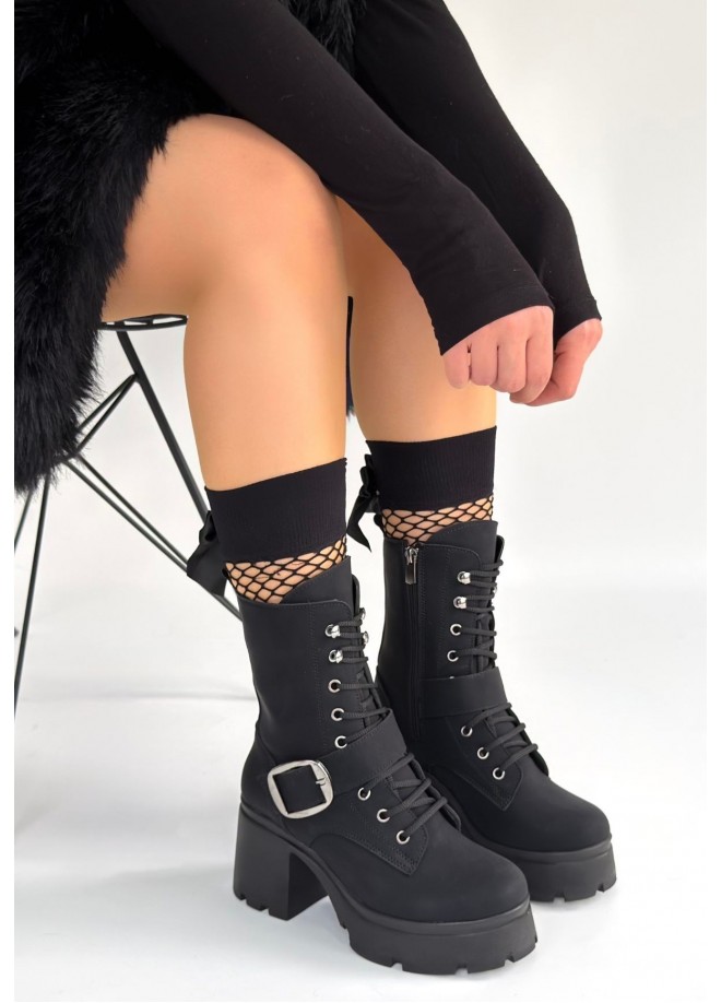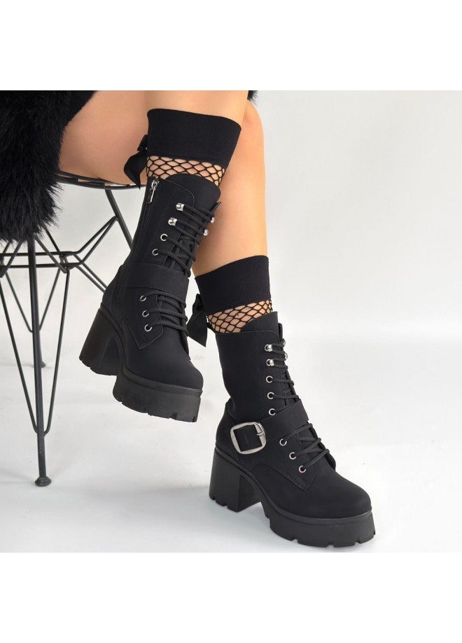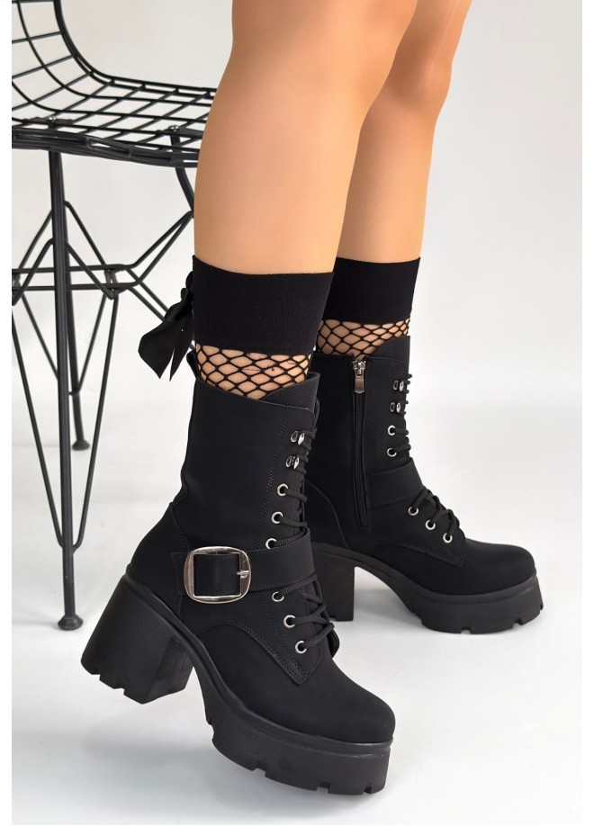 Linma Siyah Nubuk Bağcıklı Topuklu Bot