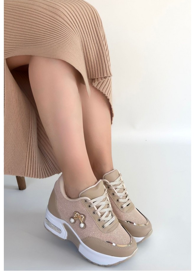 Wody Bej Cilt Simli Bağcıklı Spor Ayakkabı