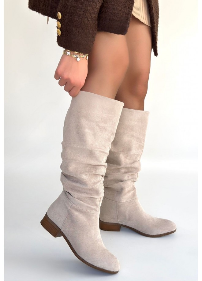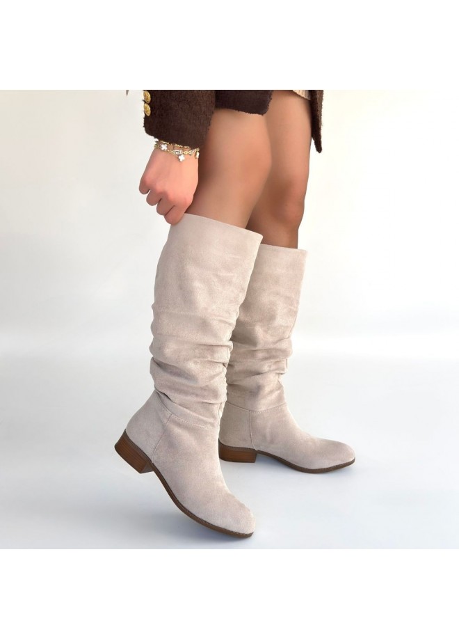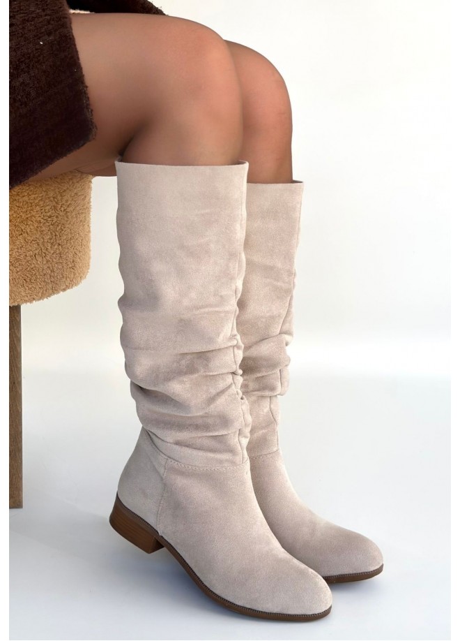 Winda Bej Süet Körüklü Topuklu Çizme