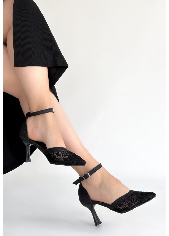 Weja Siyah Cilt Tül Detaylı Topuklu Ayakkabı