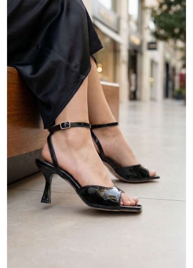 Soha Siyah Rugan Topuklu Bilekten Kemerli Ayakkabı