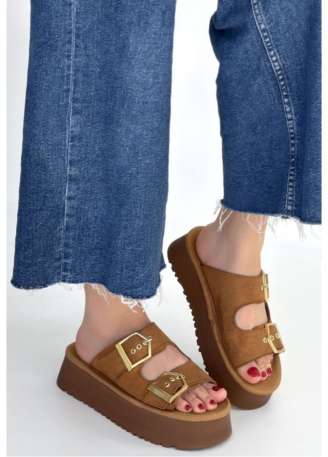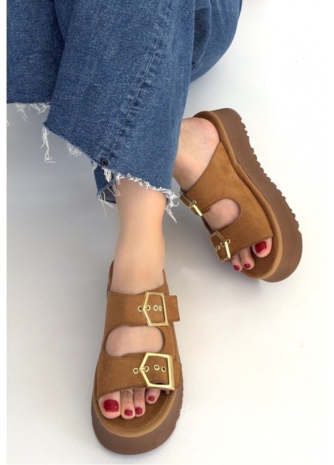 Coer Taba Süet Çift Tokalı Terlik