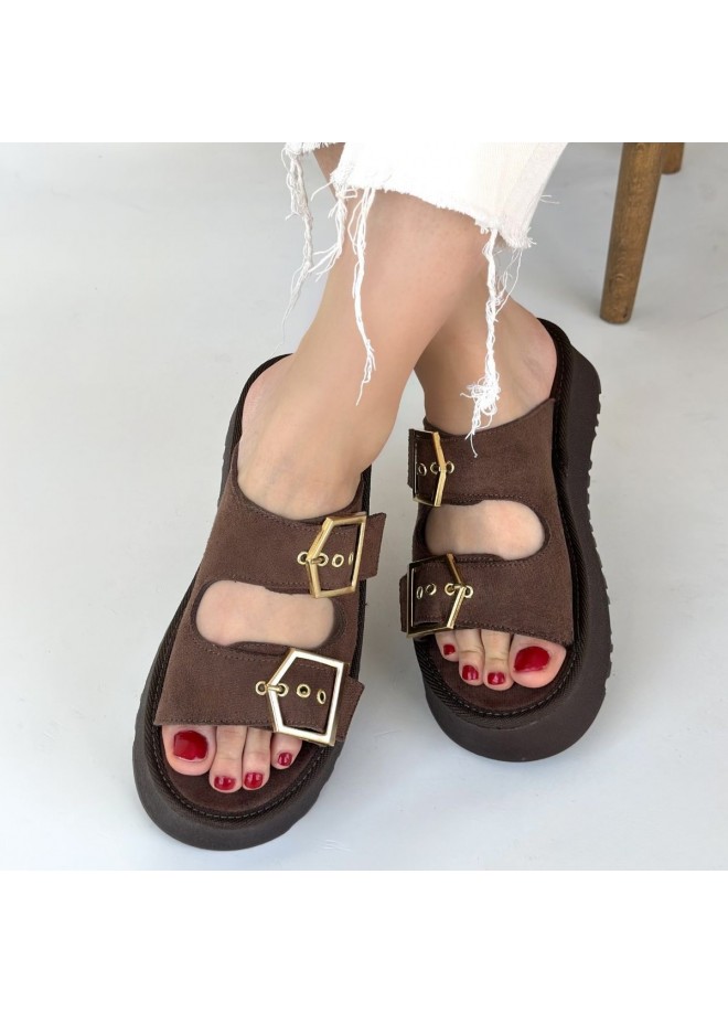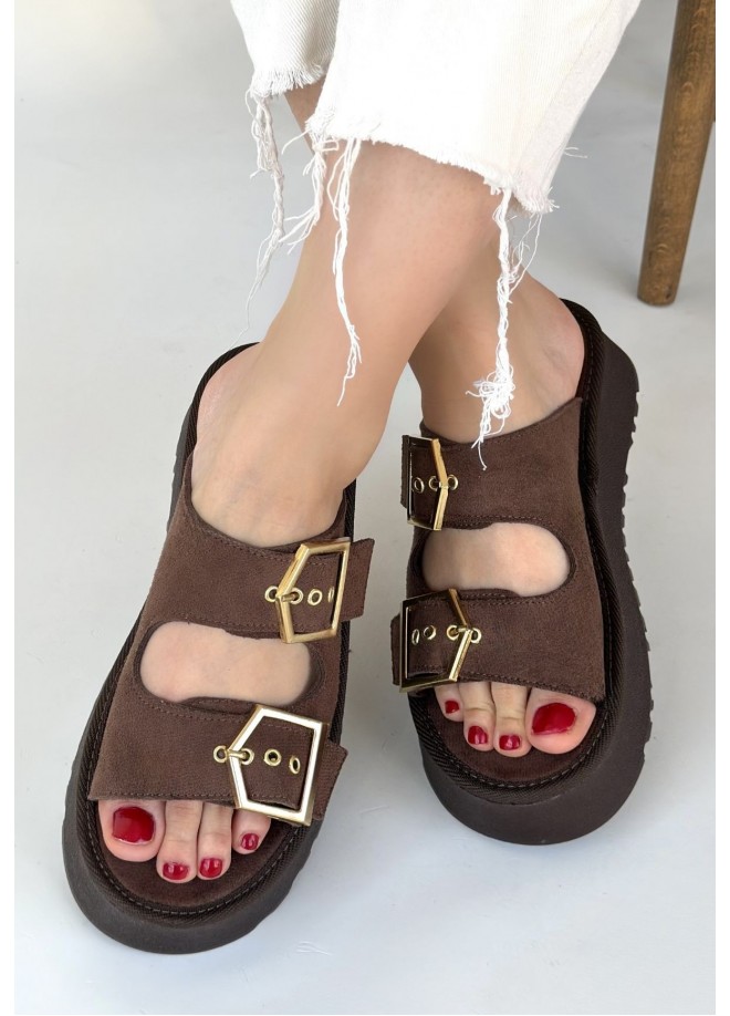 Coer Kahverengi Süet Çift Tokalı Terlik