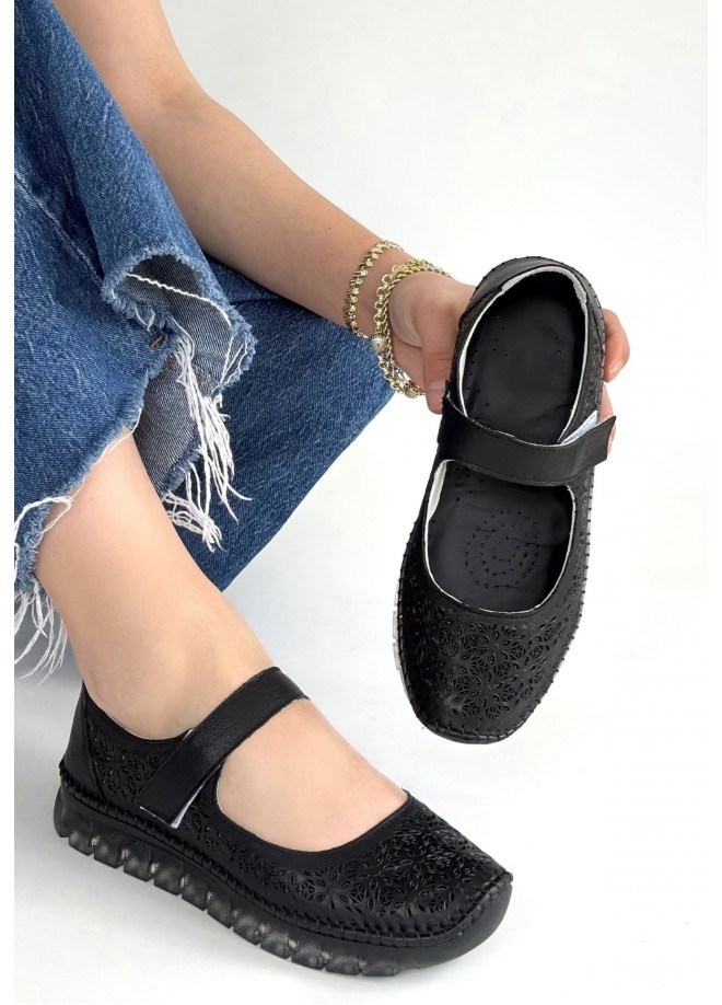 Sina Siyah Deri Cırt Cırtlı Babet Ayakkabı