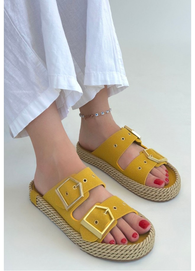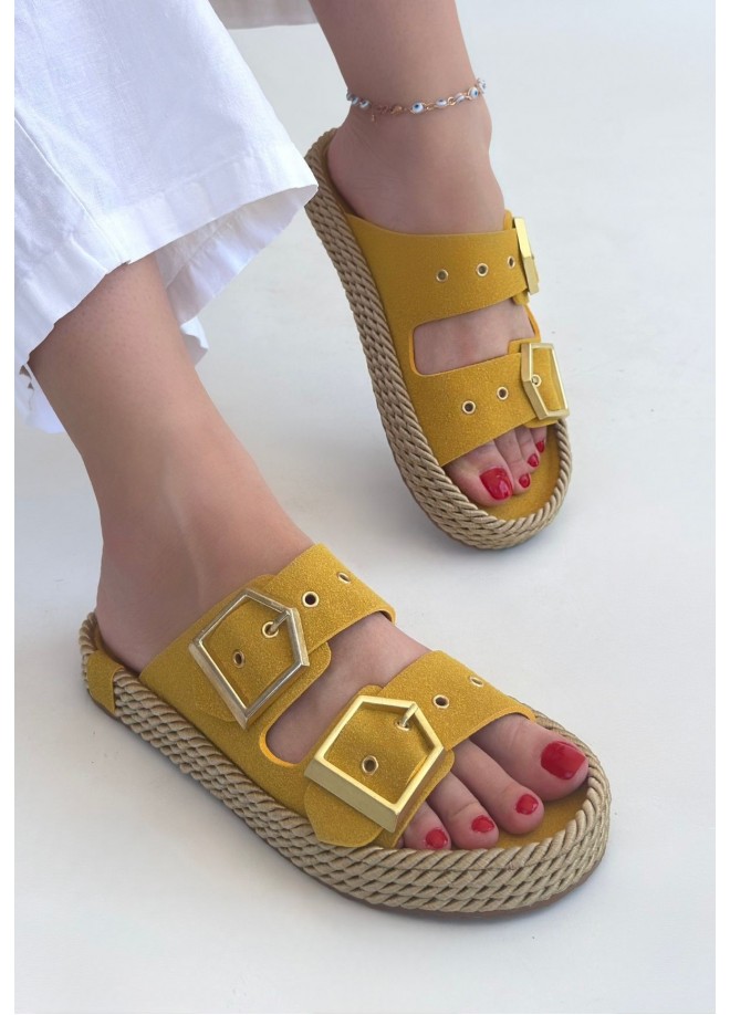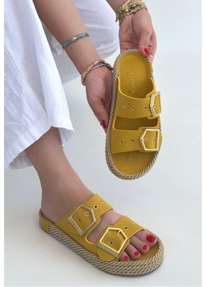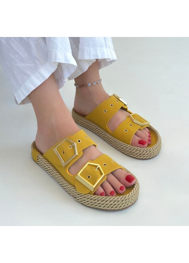 Loera Sarı Nubuk Çift Tokalı Terlik