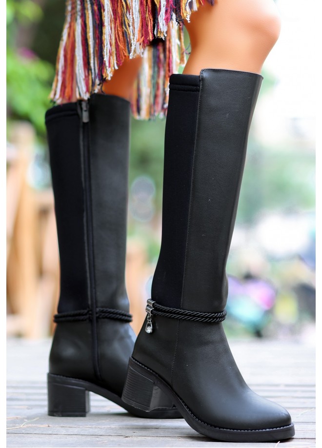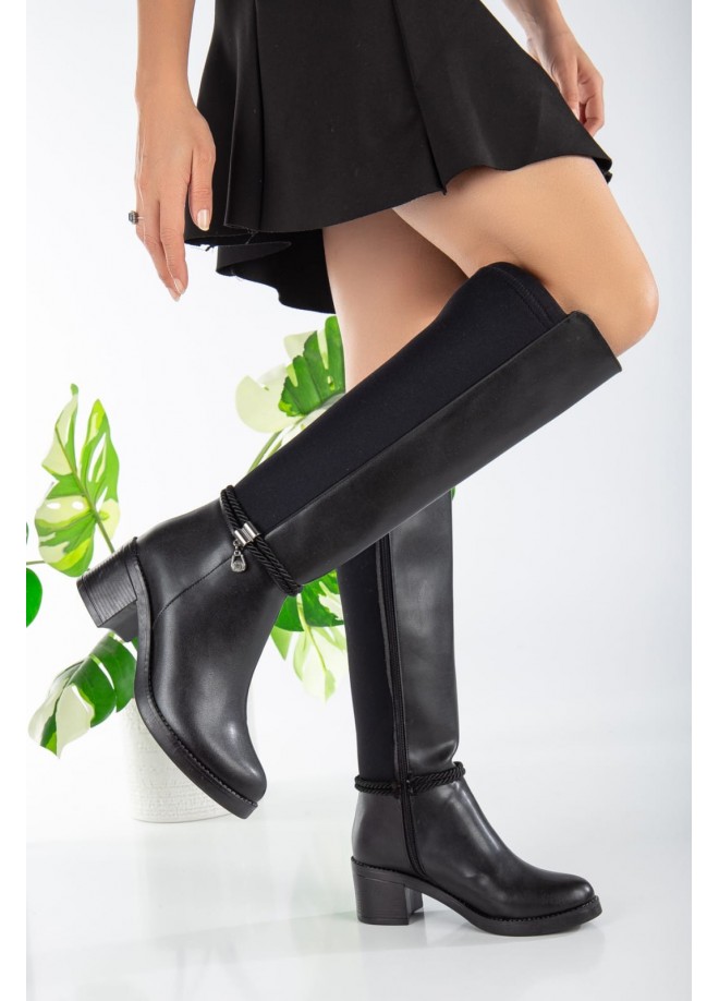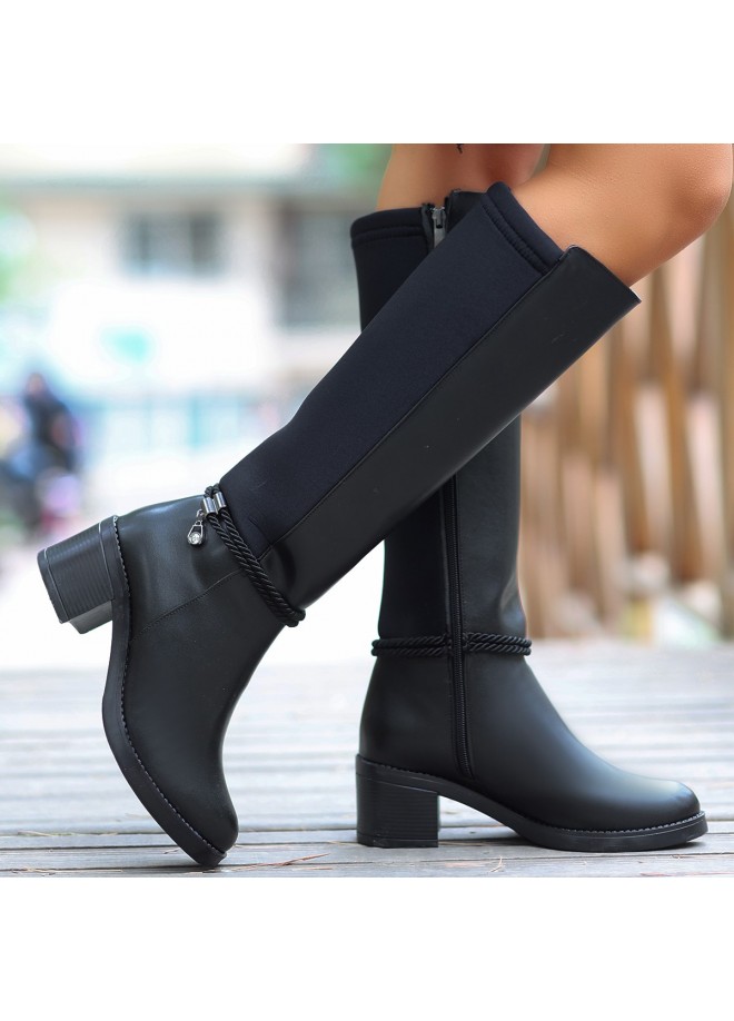 Detay: Topuklu Yandan Fermuarlı Arka Kısmı Streç Diz Altı Çizme