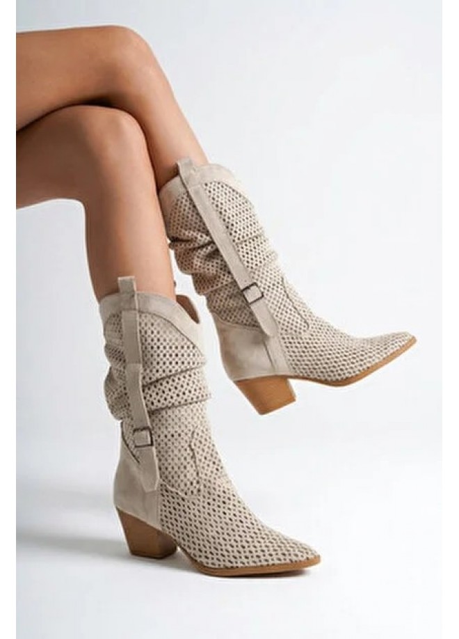 Meria Bej Süet Lazer Kesim Kovboy Topuklu Çizme