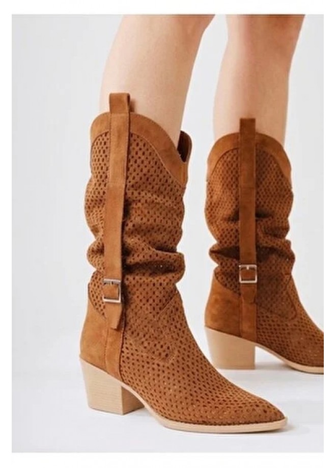 Meria Taba Süet Lazer Kesim Kovboy Topuklu Çizme