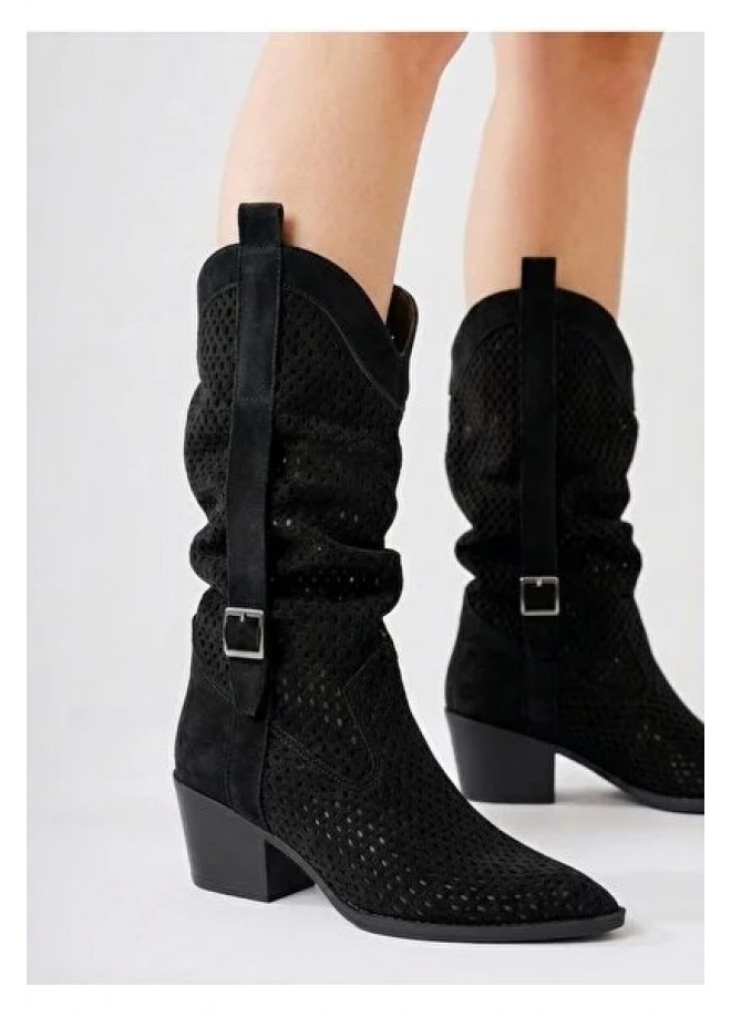 Meria Siyah Süet Lazer Kesim Kovboy Topuklu Çizme